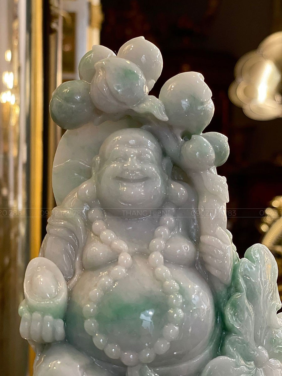 Được làm từ nguyên khối ngọc chọn lọc rất kỹ trong hàng triệu khối mới được một khối đẹp như thế. Tượng Phật Di Lặc ngọc được đặt trên khối gỗ được chạm khắc hình thỏi vàng