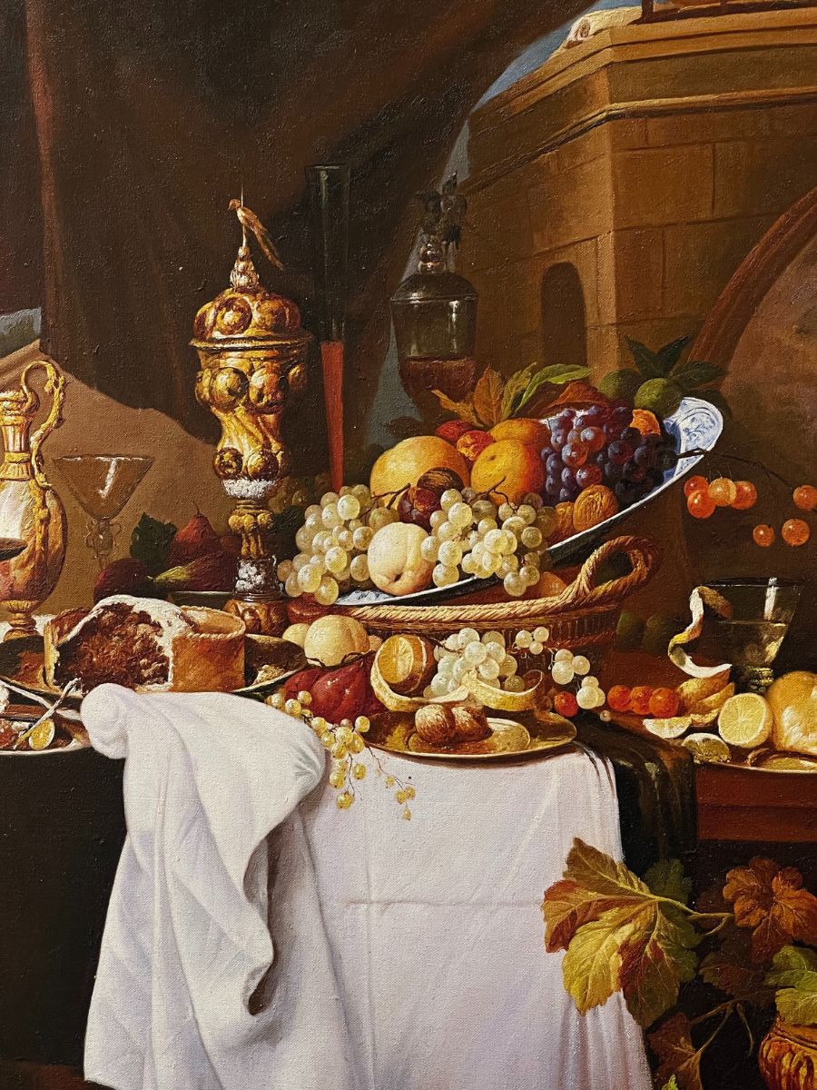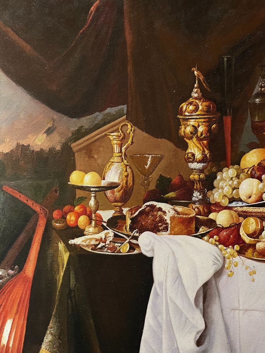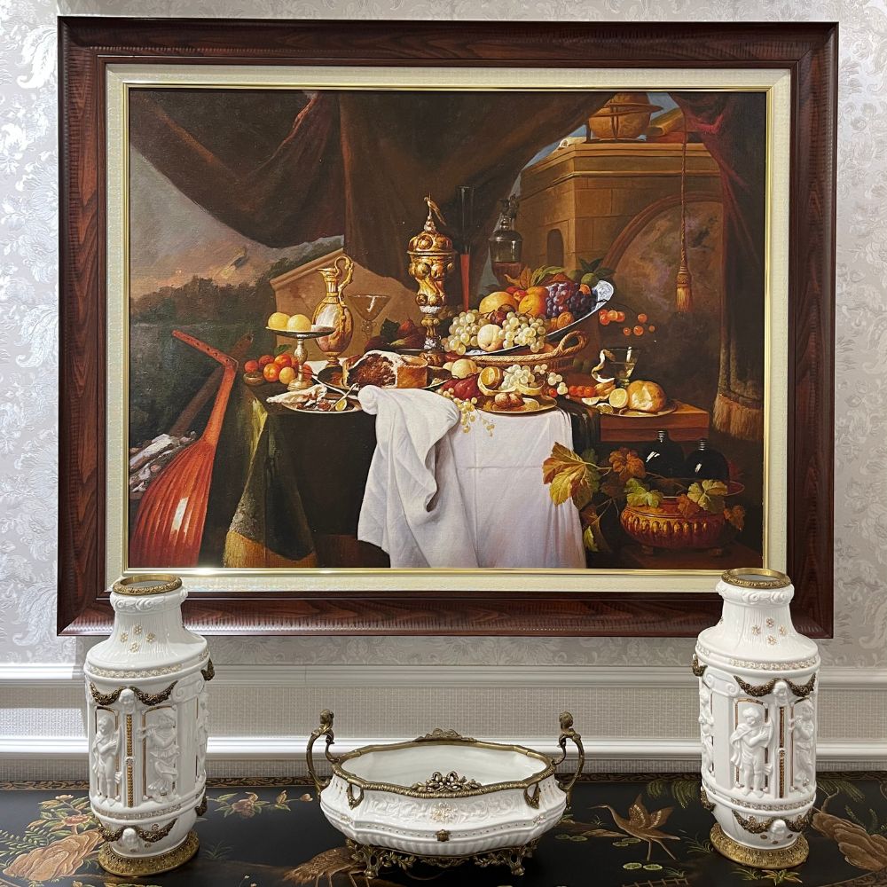 Tranh bữa tiệc hoàng gia được vẽ bởi chất liệu sơn dầu trên vải vô cùng quý phái và tinh tế. Bản sơn dầu chuyên nghiệp đẹp đến từng chi tiết. Trong thế kỷ 17, các món loại này cũng được dùng bởi tầng lớp trung lưu giàu có, thường bao gồm nhiều loại hoa quả, pho mát, thịt, rượu vang và các loại hạt.