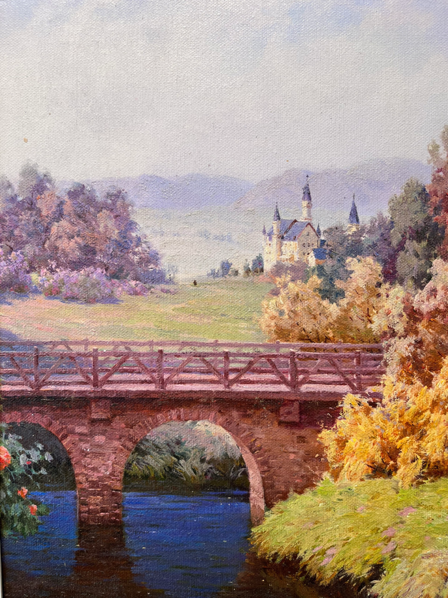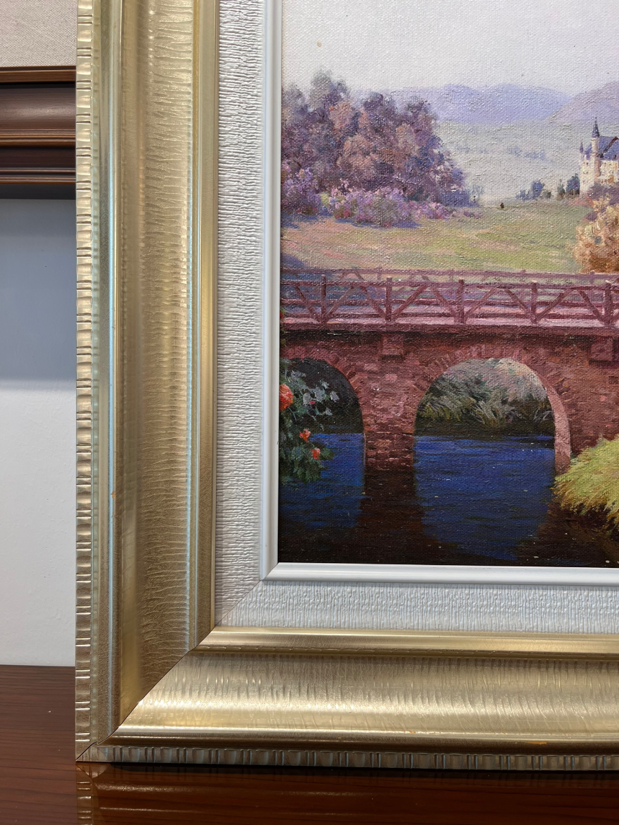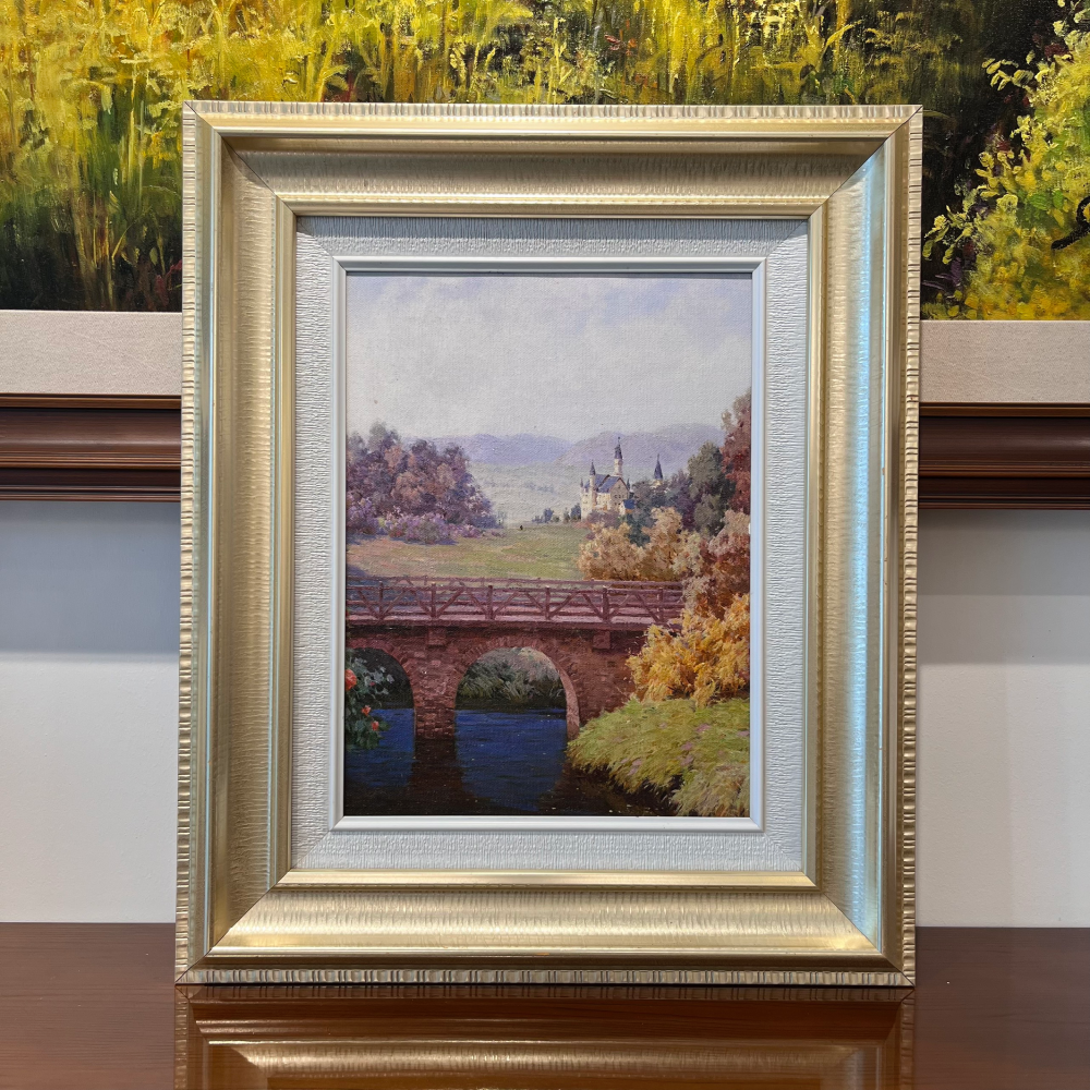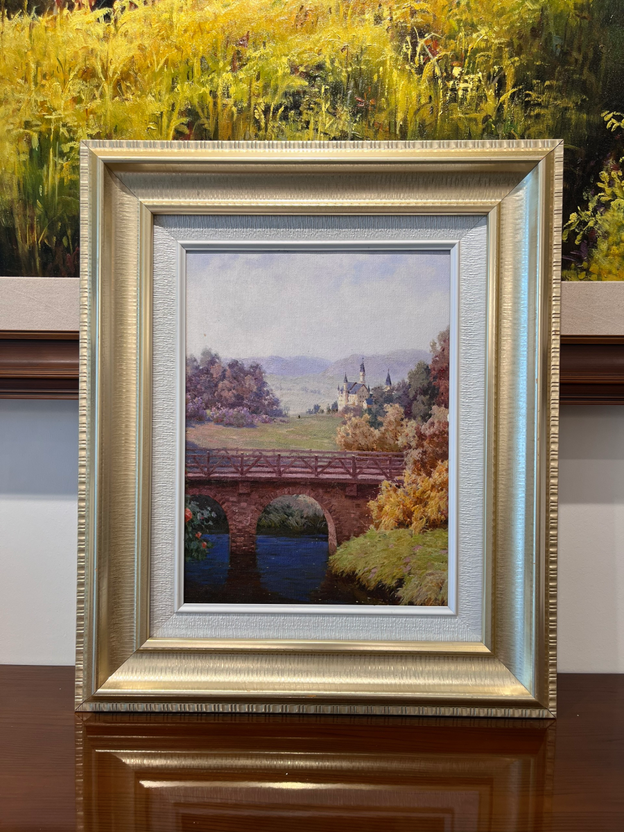 Bức tranh miêu tả một khung cảnh yên bình với một cây cầu cổ kính bắc qua một dòng suối trong xanh. Hai bên cầu là những hàng cây hoa nở rực rỡ, tạo nên một bức tranh phong cảnh sống động.