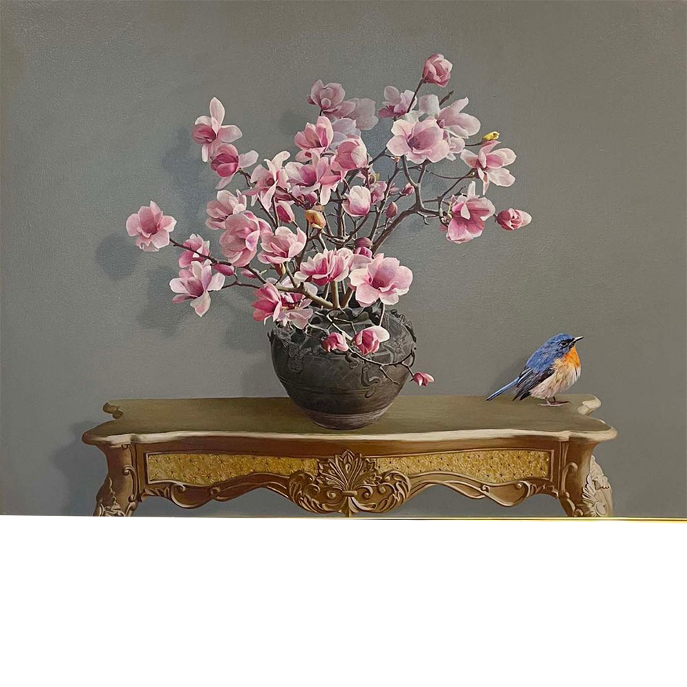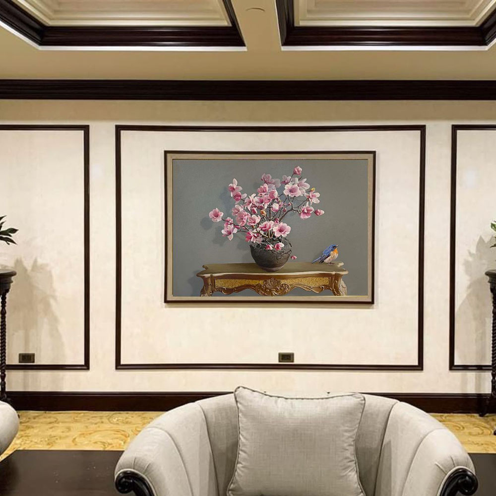 Sắc màu của từng cành hoa, góc bàn, con chim lột tả y như đang được đặt trước mắt của người xem và cảm giác có thể sờ, chạm tới, nghe được tiếng chim hót ríu rít .