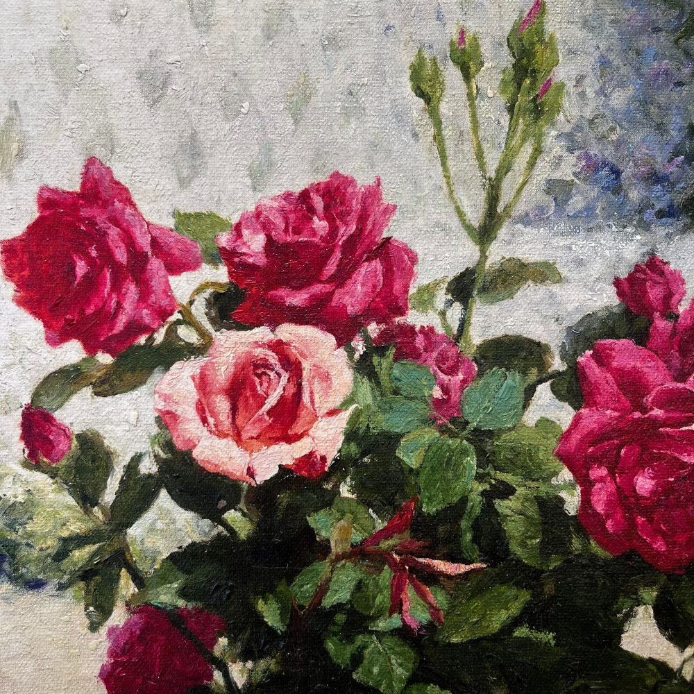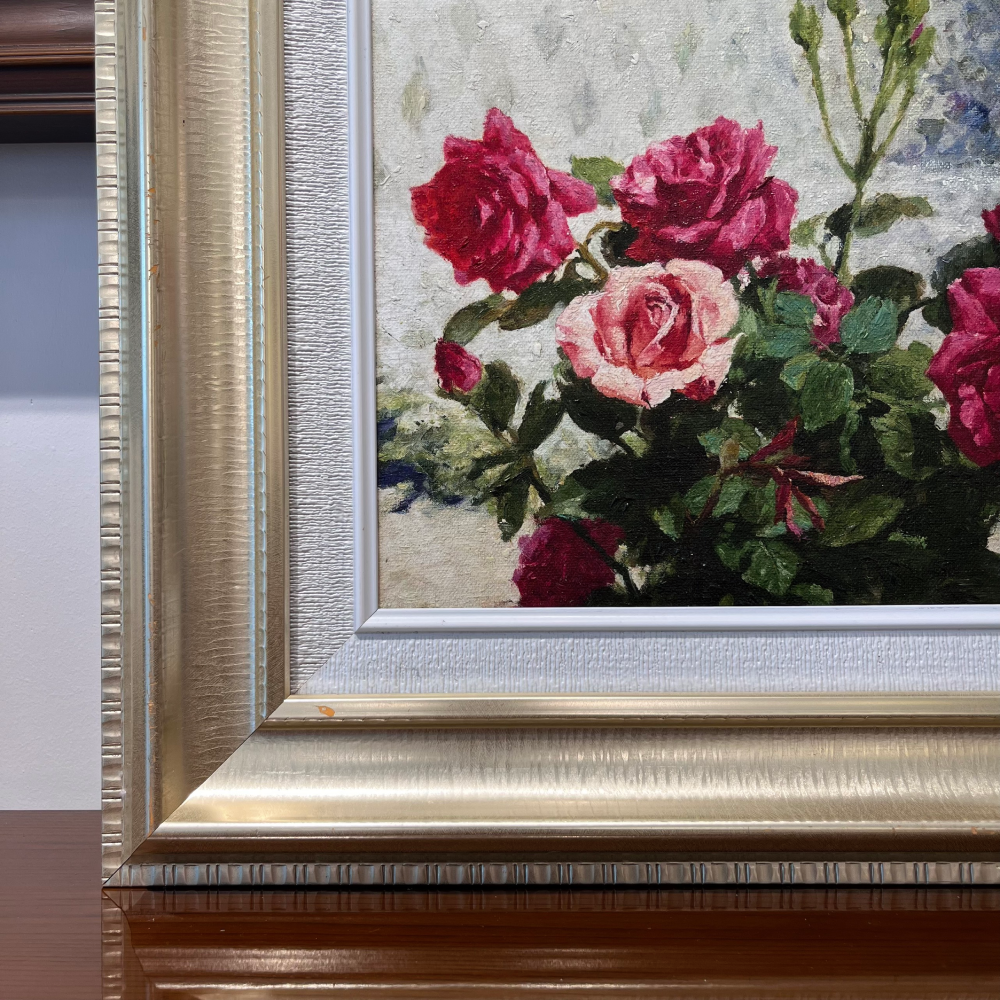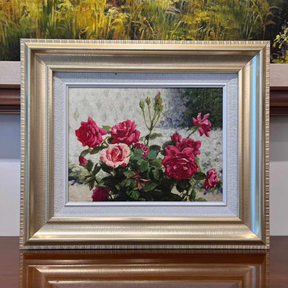 Bức tranh sơn dầu này trình bày một bức họa tuyệt đẹp của những bông hoa hồng rực rỡ. Với kỹ thuật sơn dầu tinh tế, tác giả đã thể hiện sự sống động và vẻ đẹp tự nhiên của những cánh hoa.