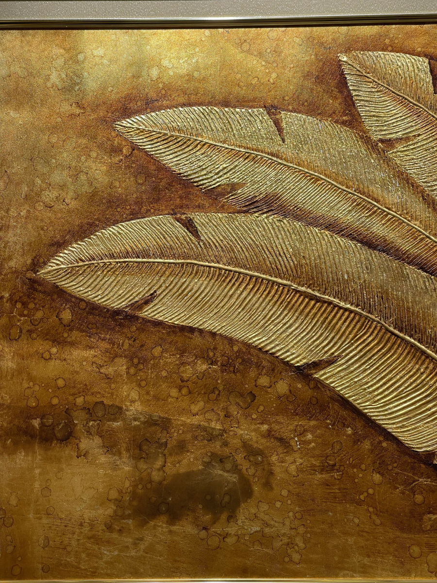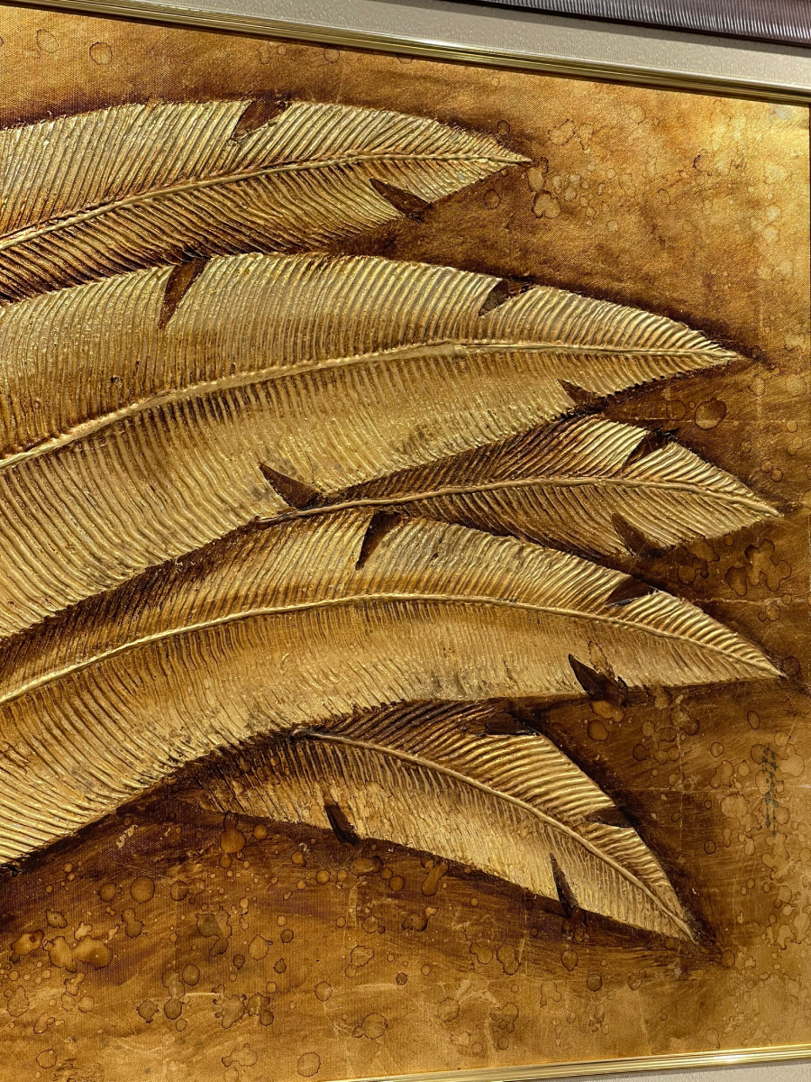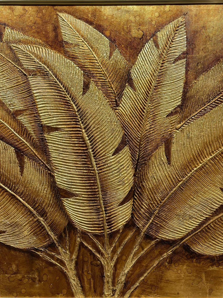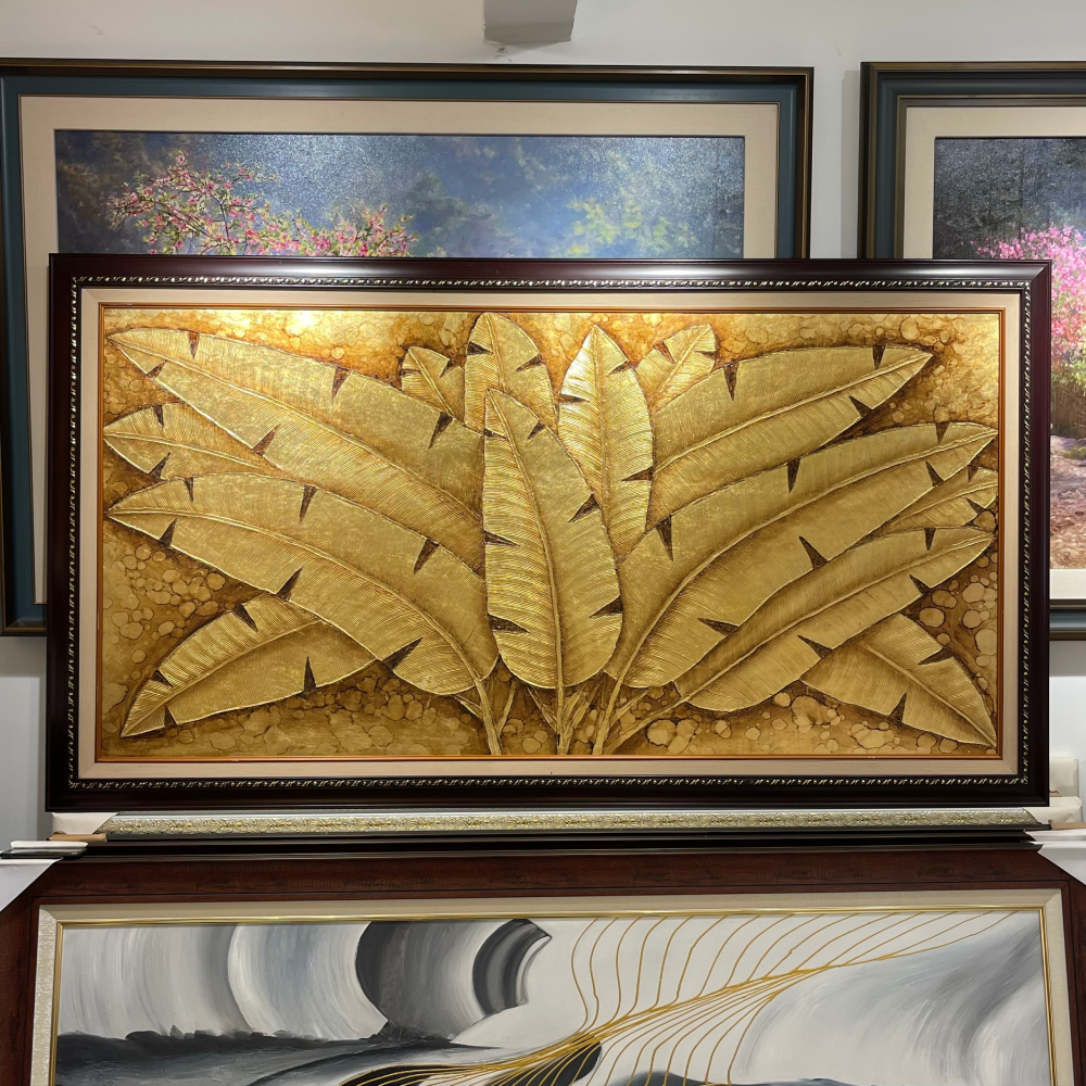 Bức tranh thể hiện những chiếc lá được dát quỳ vàng vô cùng nổi bật, tranh không theo quy tắc cụ thể nào, cho phép nghệ sĩ tự động thể hiện cảm xúc và ý tưởng của mình. Màu vàng, biểu tượng của sự thịnh vượng và sáng sủa, thường được sử dụng để tạo ra những sản phẩm ấn tượng.