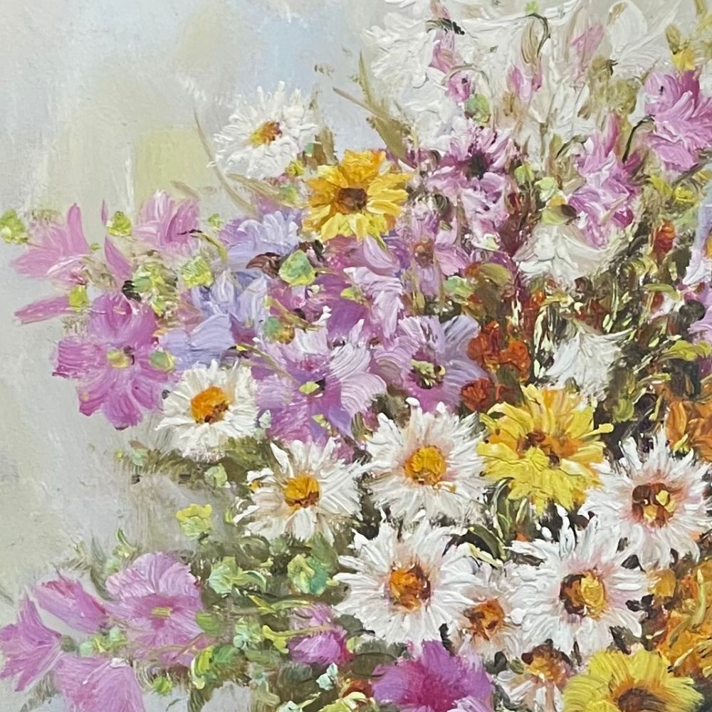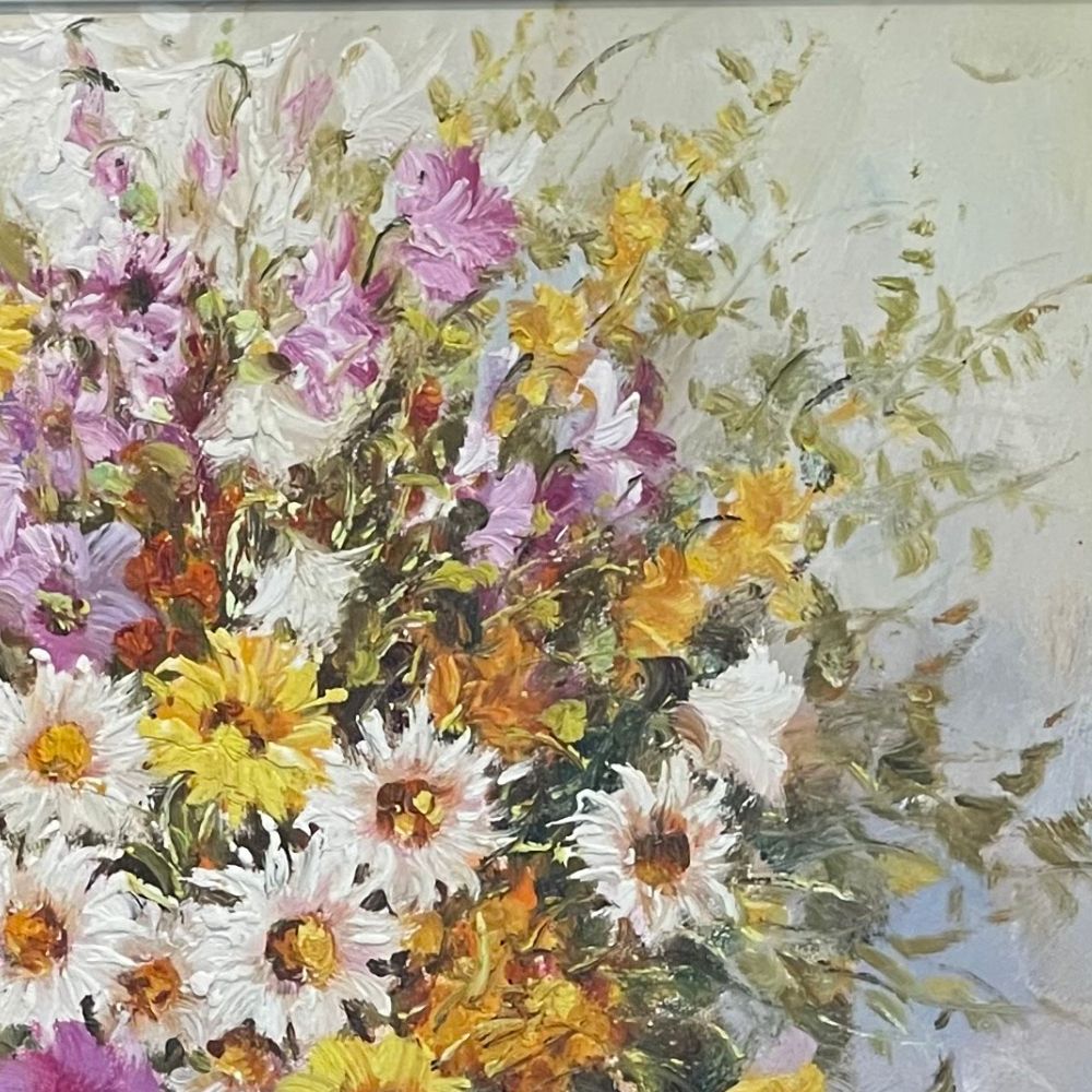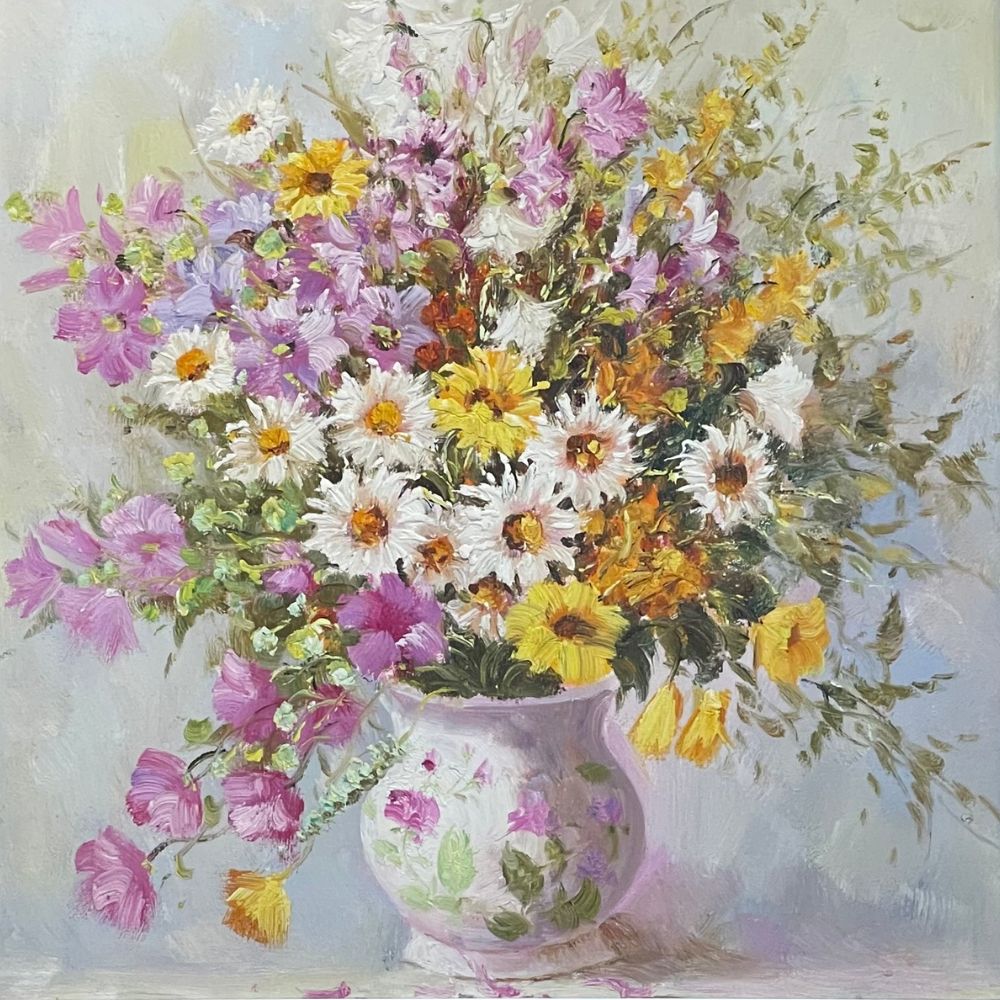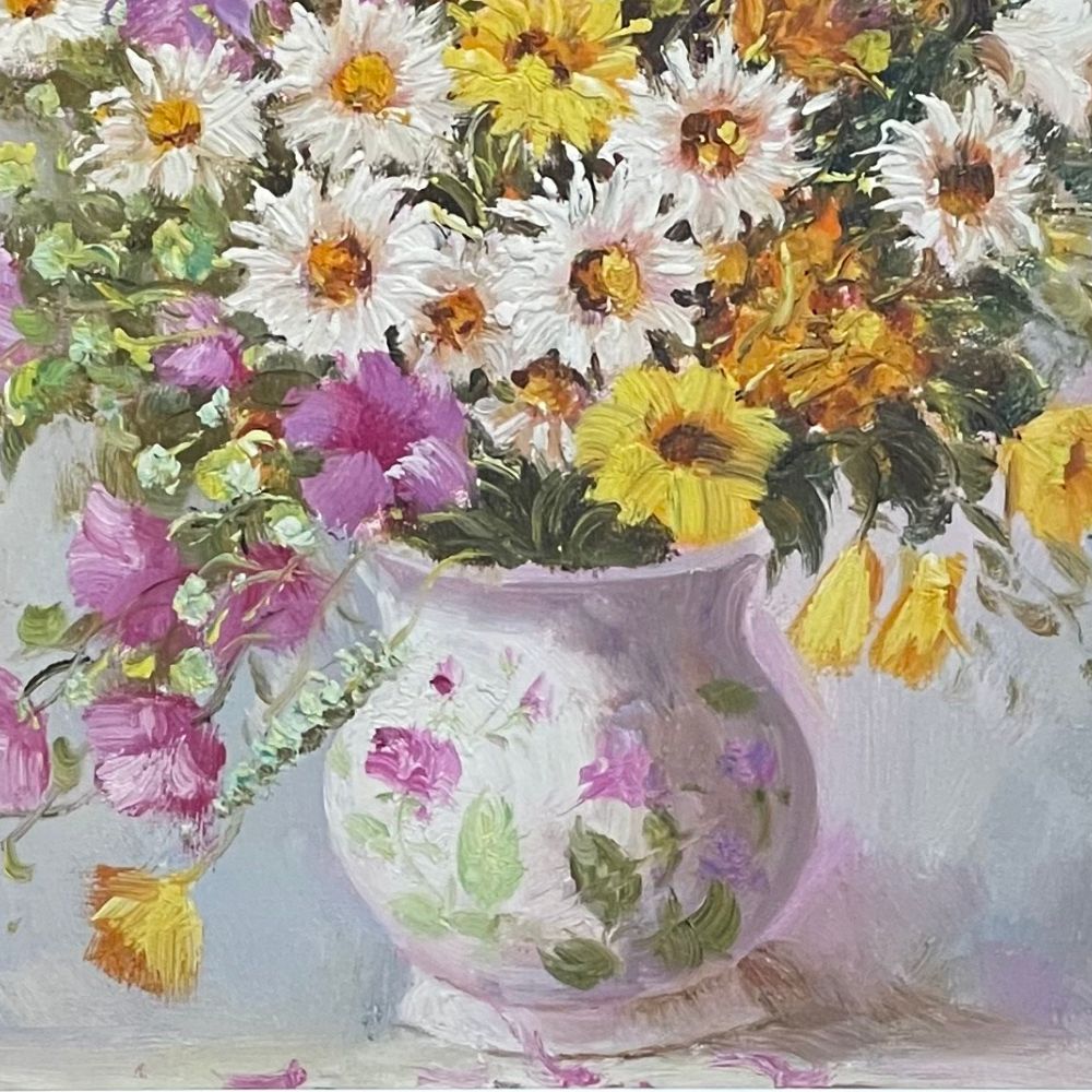 Bức tranh sơn dầu hoa cúc là một tác phẩm nghệ thuật tuyệt đẹp, thể hiện vẻ đẹp tinh tế và ý nghĩa cao quý của loài hoa này. Bức tranh vẽ một bình hoa cúc với những bông hoa nở rộ rực rỡ, khoe sắc thắm dưới ánh nắng vàng ấm áp. Những cánh hoa cúc trắng tinh khôi, mỏng manh như những cánh bướm trắng đang bay lượn trong gió.