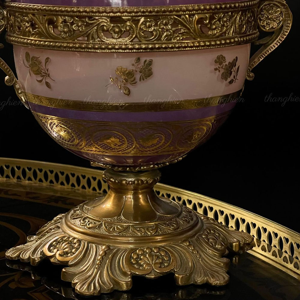 Nụ hoa đồng trên phần nắp giúp việc đóng mở được dễ dàng, cùng những họa tiết đồng xung quanh phần miệng kéo dài tới chân là đế đồng tăng thêm độ vững chãi và mềm mại cho sản phẩm. Hai bên là hoa đồng uốn vươn lên cùng họa tiết hoa lá mạ vàng vẽ xung quanh giống như lạc vào xứ sở trăm hoa trong khu vườn cổ tích.