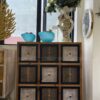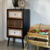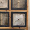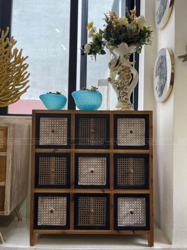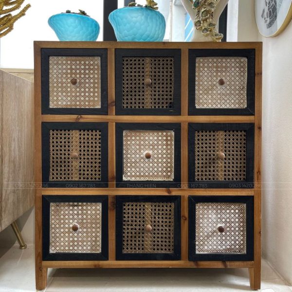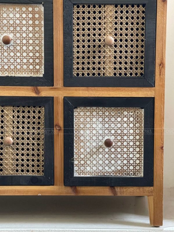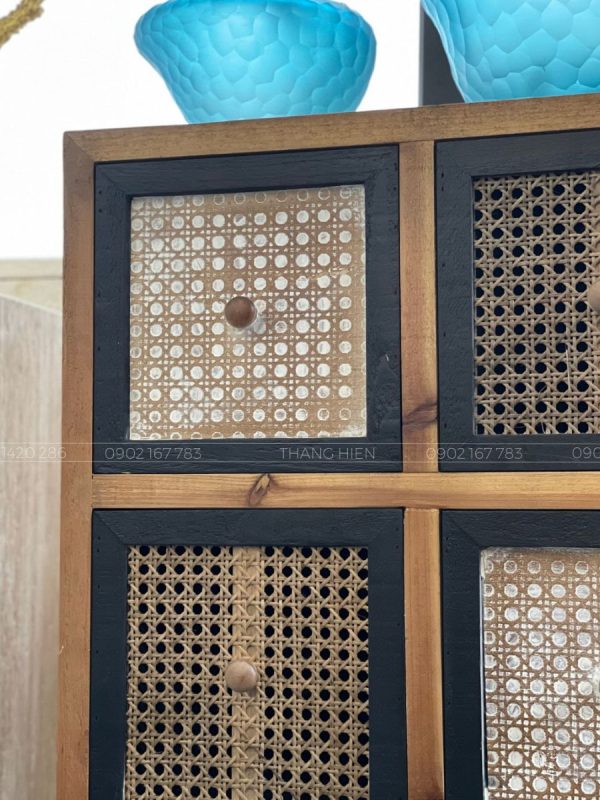 Tủ gỗ đan mây được làm bằng gỗ thông tự nhiên, được thiết kế 9 ngăn cánh tủ giả đan mây với 3 tone màu chính trắng đen và màu gỗ óc chó mang vẻ đẹp vintage tinh tế.