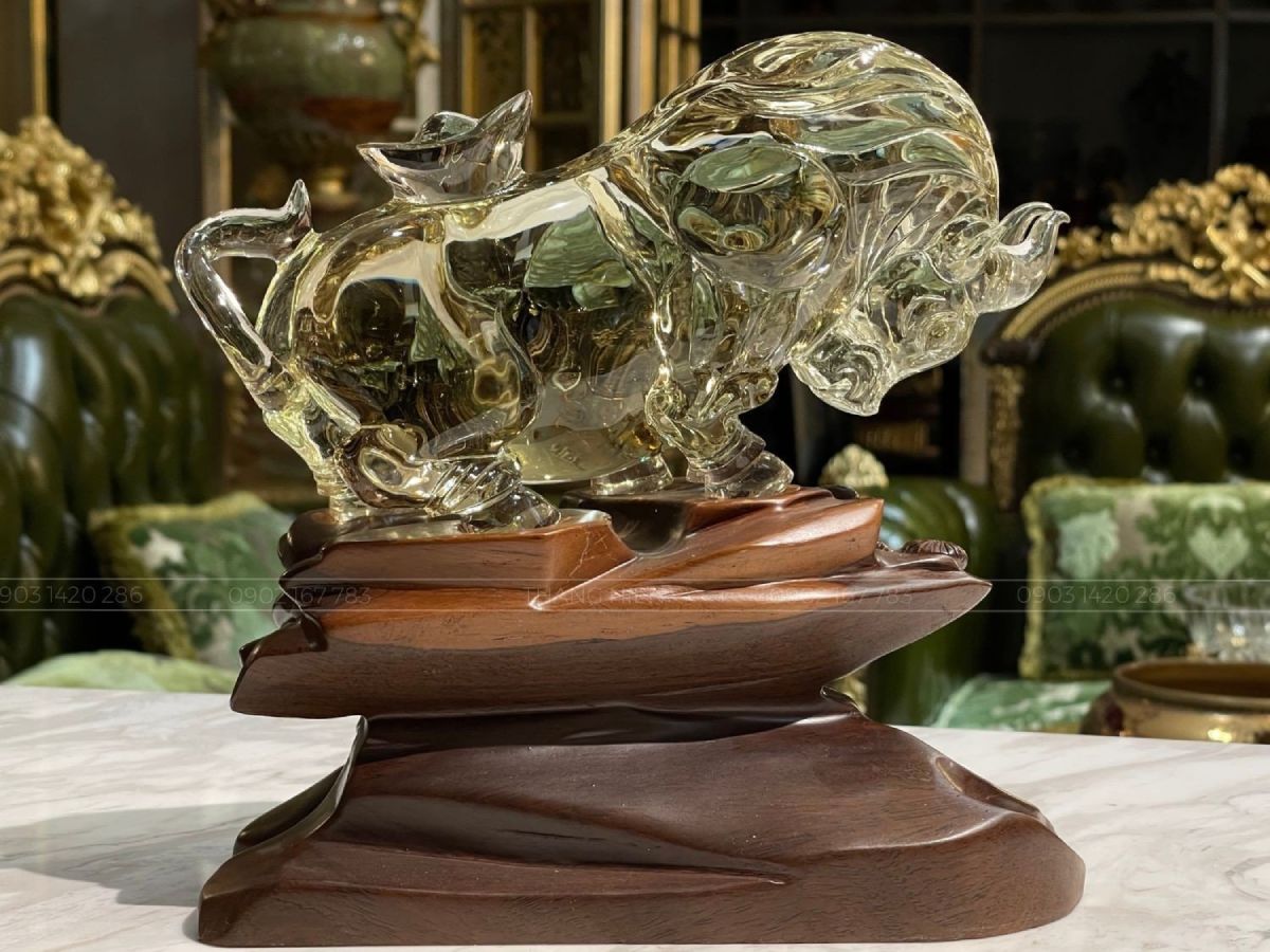 Bò tót được tạo nên từ thạch anh vàng, được các nghệ nhân tạc thủ công tạo nên hình ảnh bò tót vô cùng tinh xảo kết hợp đứng trên đế gỗ.