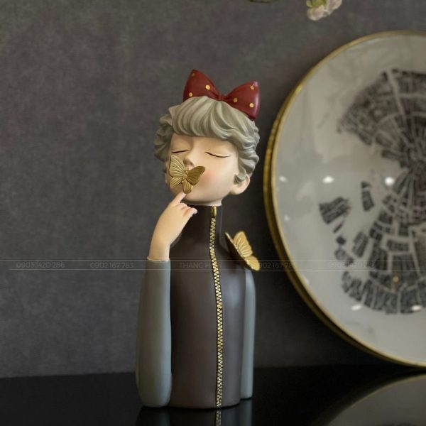 - Hình ảnh cô gái má đỏ môi hồng yêu đời, thần thái vui vẻ, hạnh phúc , đang trêu đùa cùng những chú bướm bằng đồng mạ vàng vô cùng sinh động.